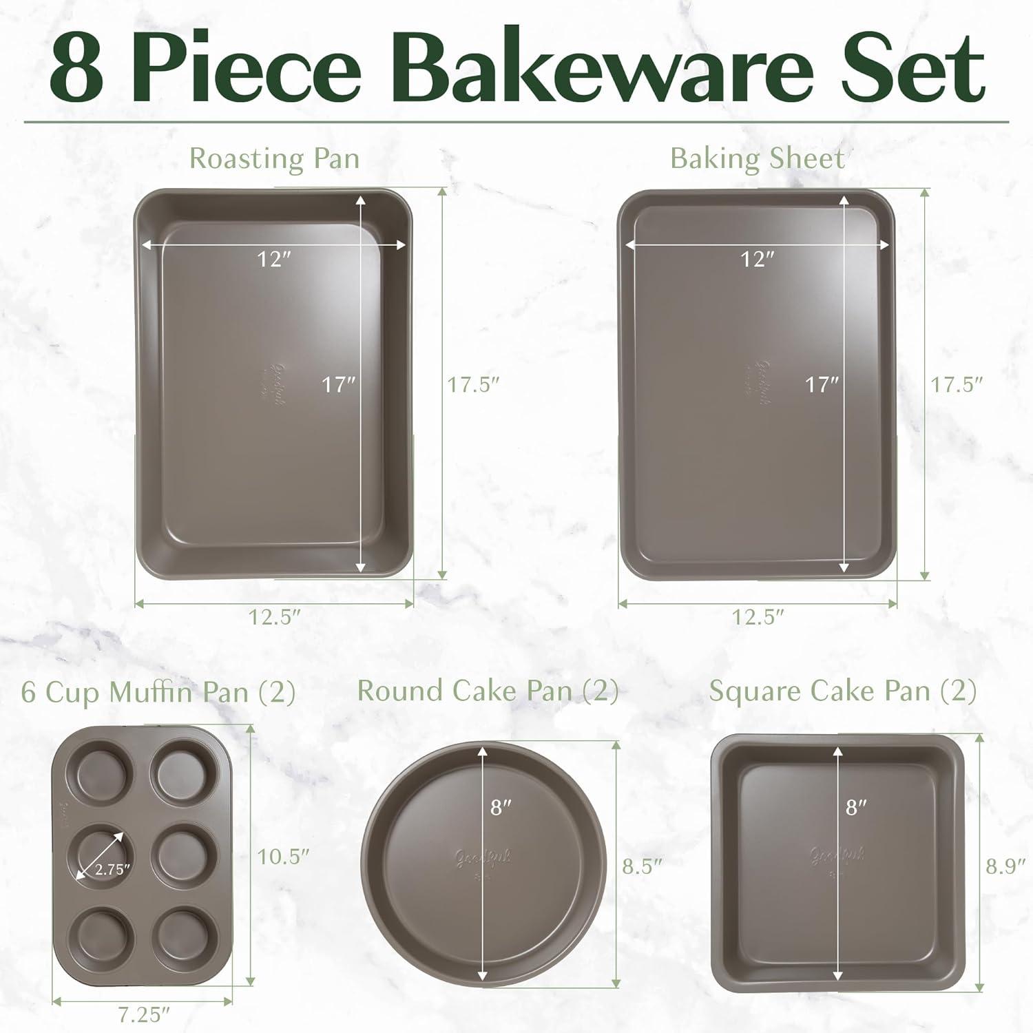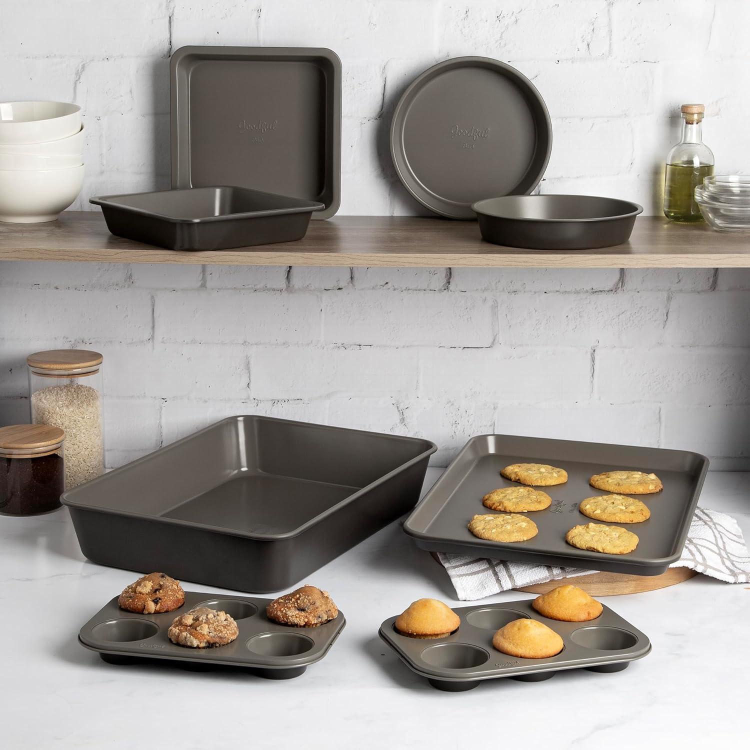 The Goodful All-In-One Nonstick Bakeware Set has everything you need for baking cakes, cookies, muffins, and more. The 8-piece collection includes two 8-inch round cake pans, two 8-inch square cake pans, two 6-cup muffin or cupcake pans, one 17 x 12-inch cookie sheet and one 17 x 12-inch roasting pan. This bakeware set has a stackable, space-saving design. All eight pieces are shaped to nest perfectly into each other, allowing the entire set to be stored together in a compact 17.5 x 12.5 x 3.5 inch footprint. Oven safe to 400°F and crafted from high-quality carbon steel that delivers even heat distribution for consistent baking results. The rolled edge design resists warping and bending over time while the premium nonstick coating delivers effortless food release. The premium nonstick coating is made without PFAS, PFOA, PTFE, lead, cadmium, toxic metals, or nanoparticles, so you can bake with confidence. And because it's dishwasher safe, cleanup is a breeze. With its complete assortment of baking essentials, space-saving nested storage, durable construction and premium nonstick, the Goodful All-In-One Bakeware Set has everything you need for convenient, high-performance baking. Pair it with the Goodful All-in-One Pan and All-in-One Pot for a complete kitchen solution, simplifying your cooking and delivering outstanding results. Visit the Goodful Brand store for a wide range of cookware, bakeware, food storage solutions, gadgets, and more.