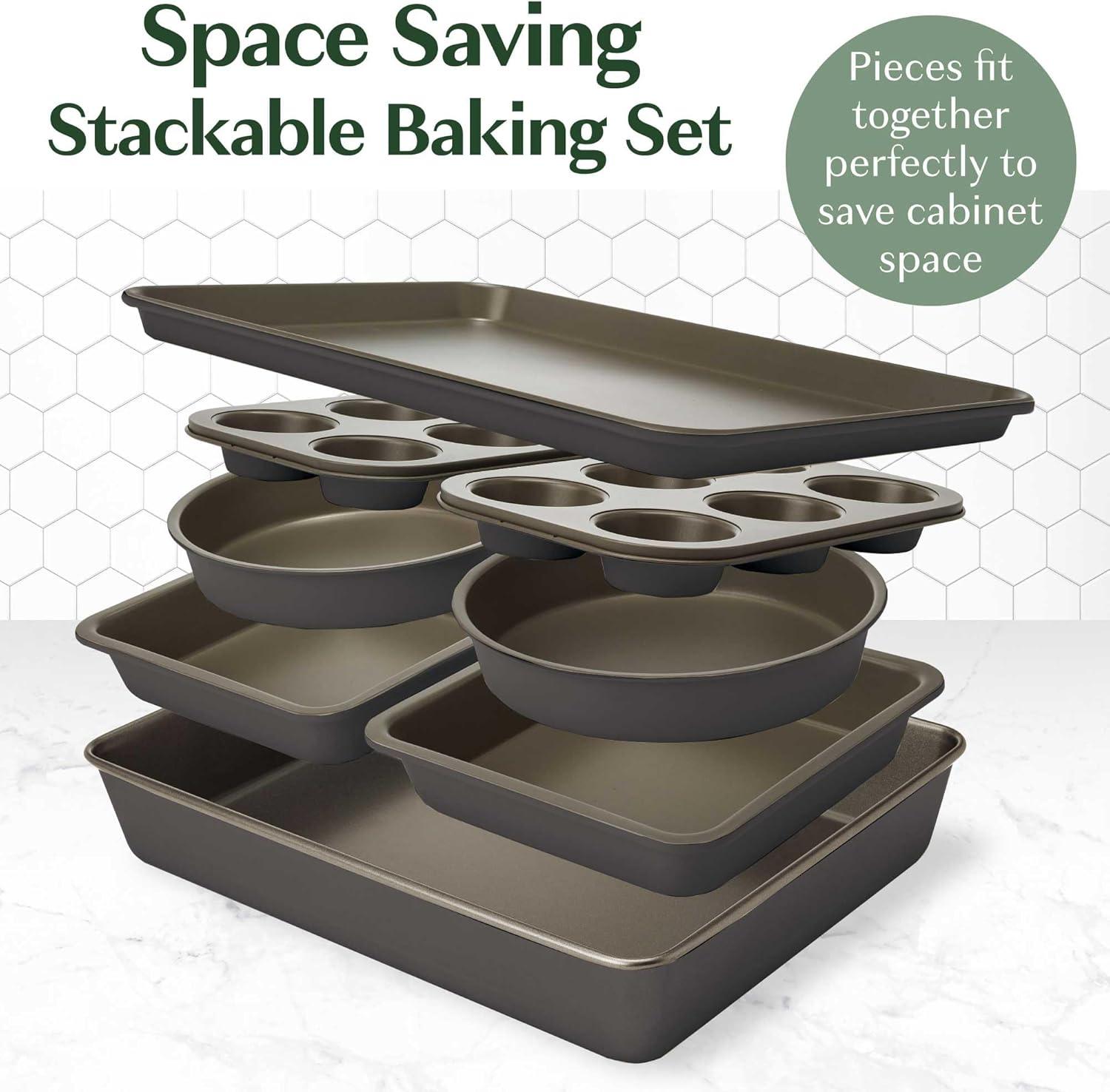 STACKABLE, SPACE SAVING DESIGN: All eight bakeware pieces were designed to completely nest into one another for compact storage and a clutter-free cabinet. The end result…a complete bakeware collection within a 17.5 x 12.5 x 3.5 inch footprint.